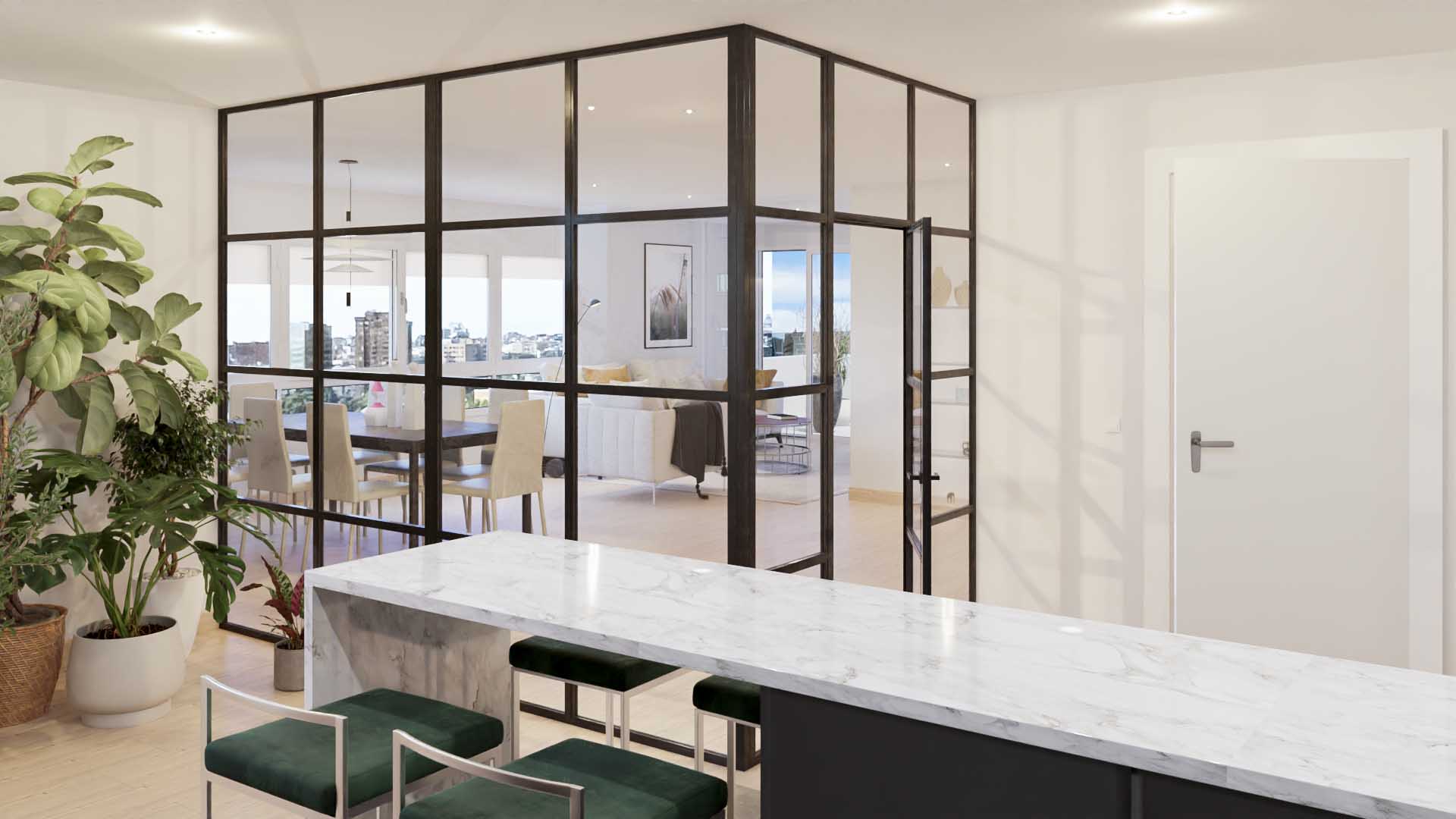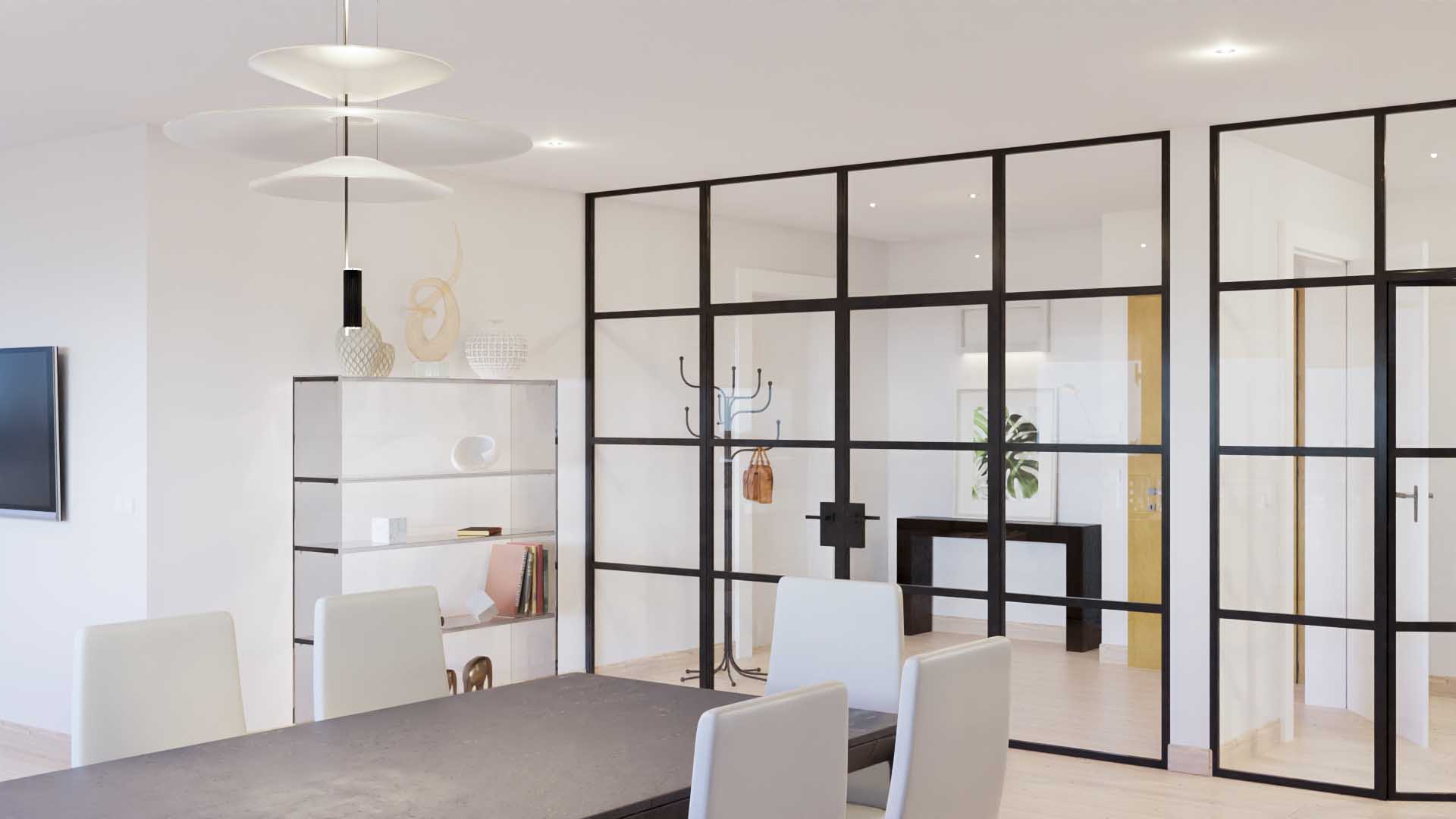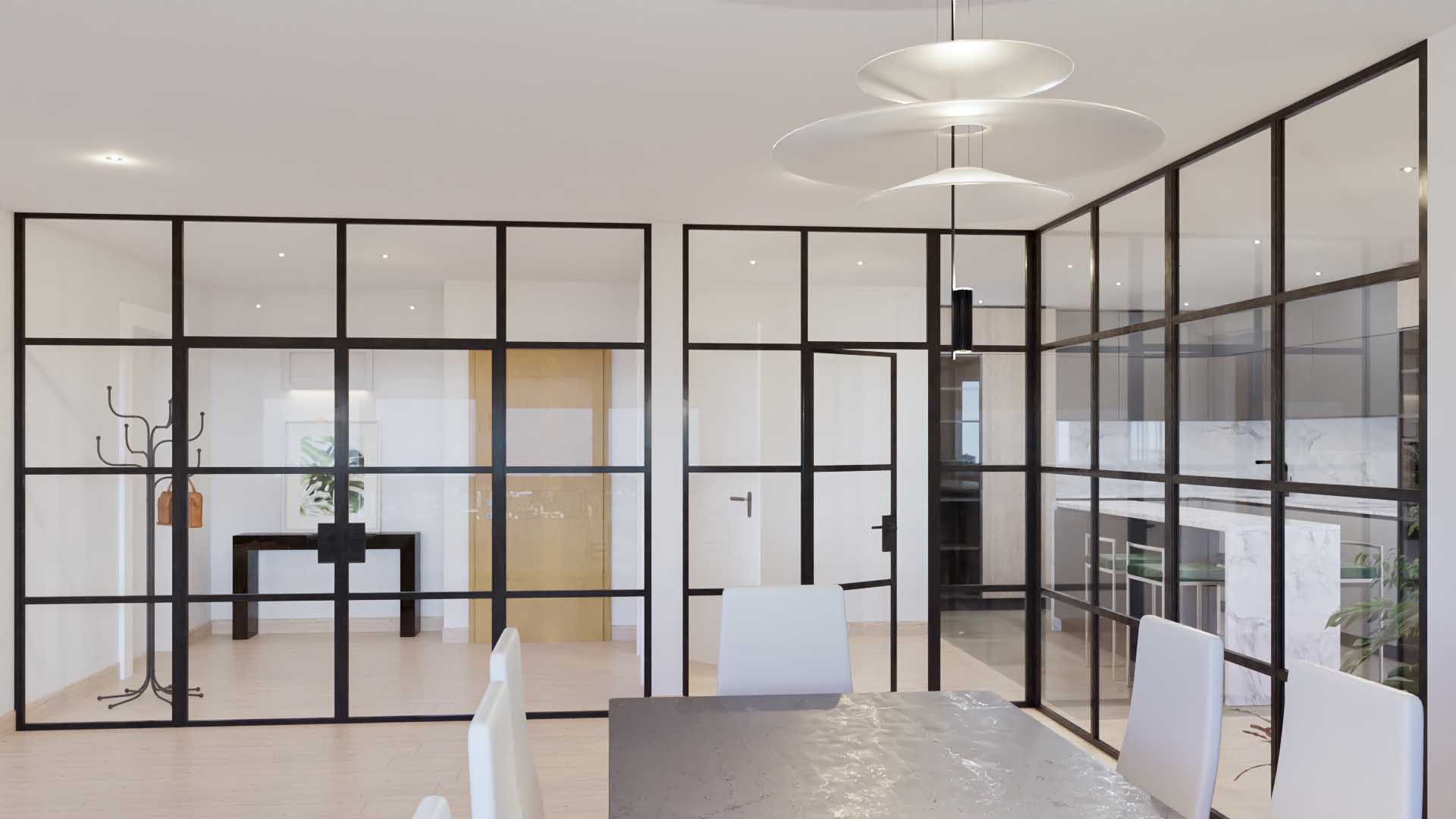 Ejemplo: Transformación de salón comedor con separadores de ambiente de cristal a cocina y recibidor, cancelación de puerta de un tabique y transformación de despacho adyacente al salón en una terraza.