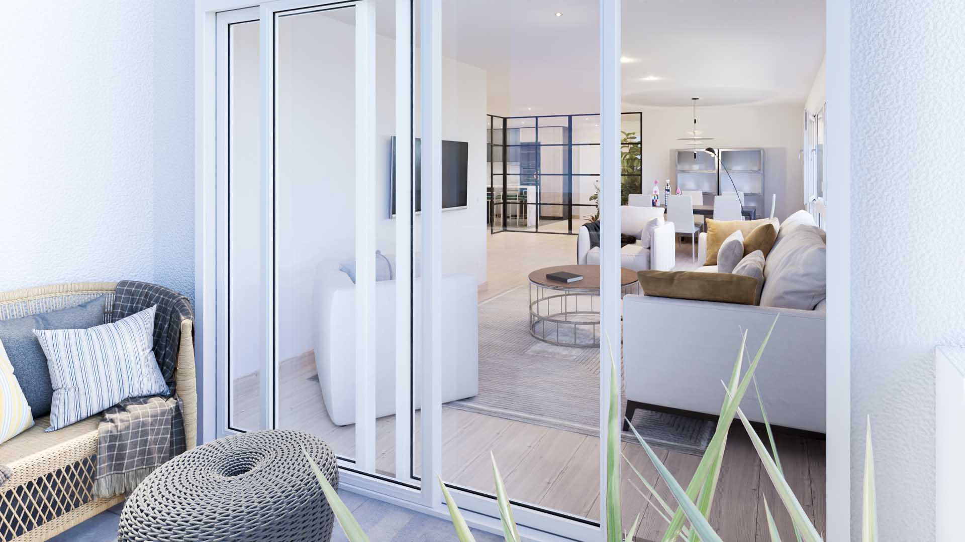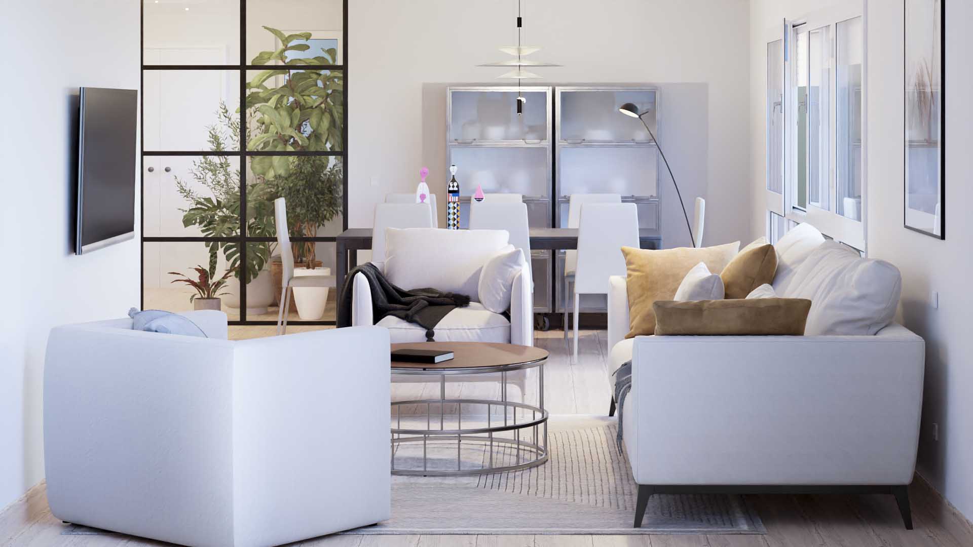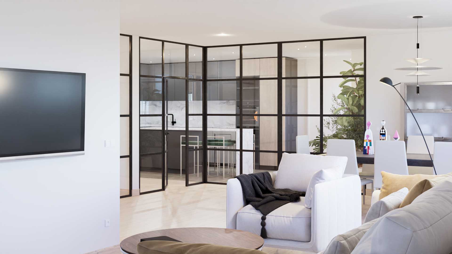Ejemplo: Transformación de salón comedor con separadores de ambiente de cristal a cocina y recibidor, cancelación de puerta de un tabique y transformación de despacho adyacente al salón en una terraza.